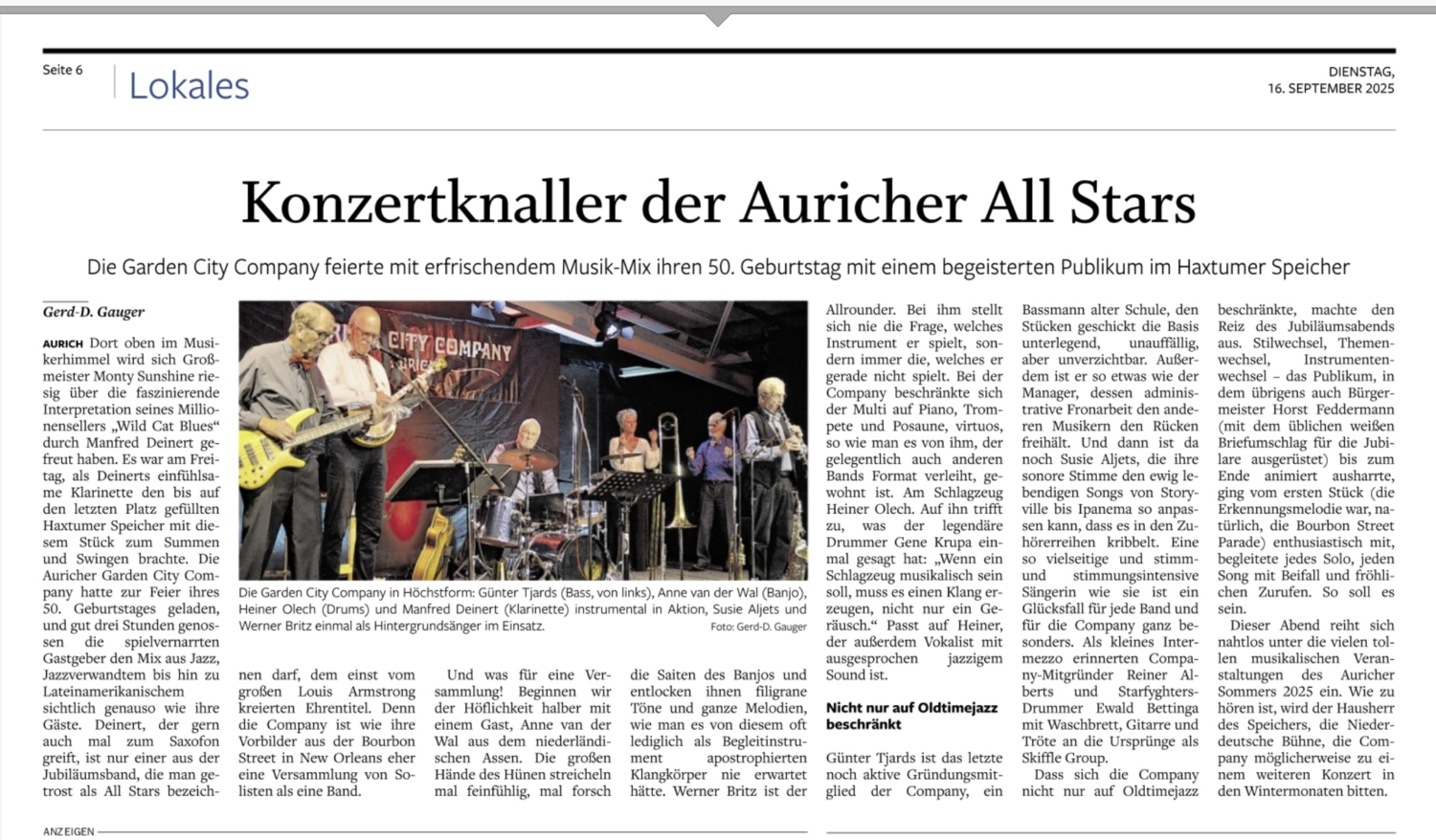 Am 16. September 2025 berichtete die Ostfriesen-Zeitung über unseren großen Jubiläumsauftritt im Haxtumer Speicher. Unter dem Titel „Konzertknaller der Auricher All Stars“ würdigte der Artikel die mitreißende Stimmung und den abwechslungsreichen Musikmix, mit dem wir unser 50-jähriges Bestehen gefeiert haben. Von Jazzklassikern über Latinrhythmen bis zu Evergreens – das Publikum war begeistert, und die Band bekam reichlich Beifall für ihren energiegeladenen Auftritt.